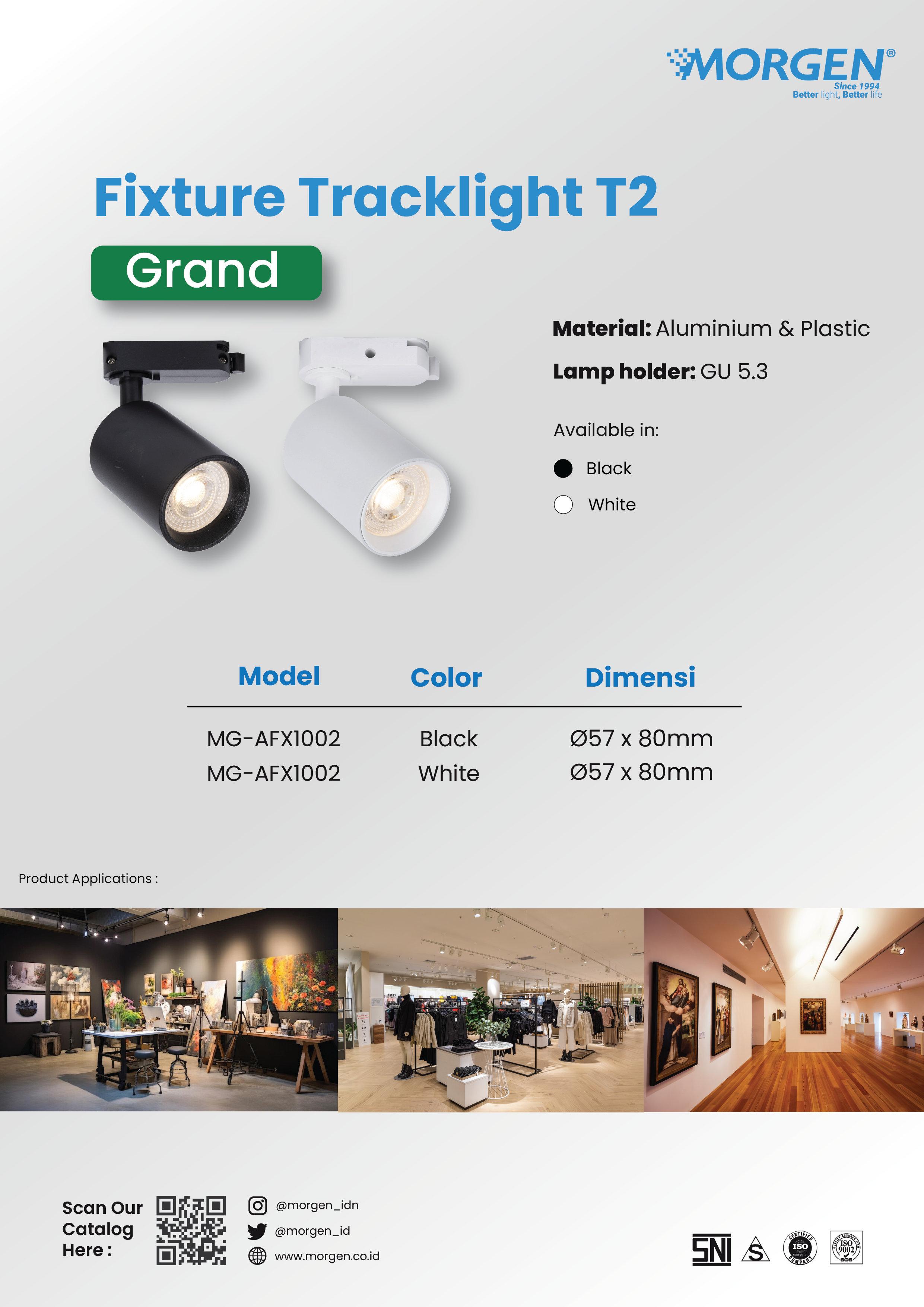 Morgen Fixture Tracklight T2 is a lamp housing better known as a lamp socket or lamp holder. Used as a connection between the lamp and the power source and functions to hold or hang the lamp safely. Suitable for various applications in commercial spaces such as art galleries, exhibitions, and clothing stores.