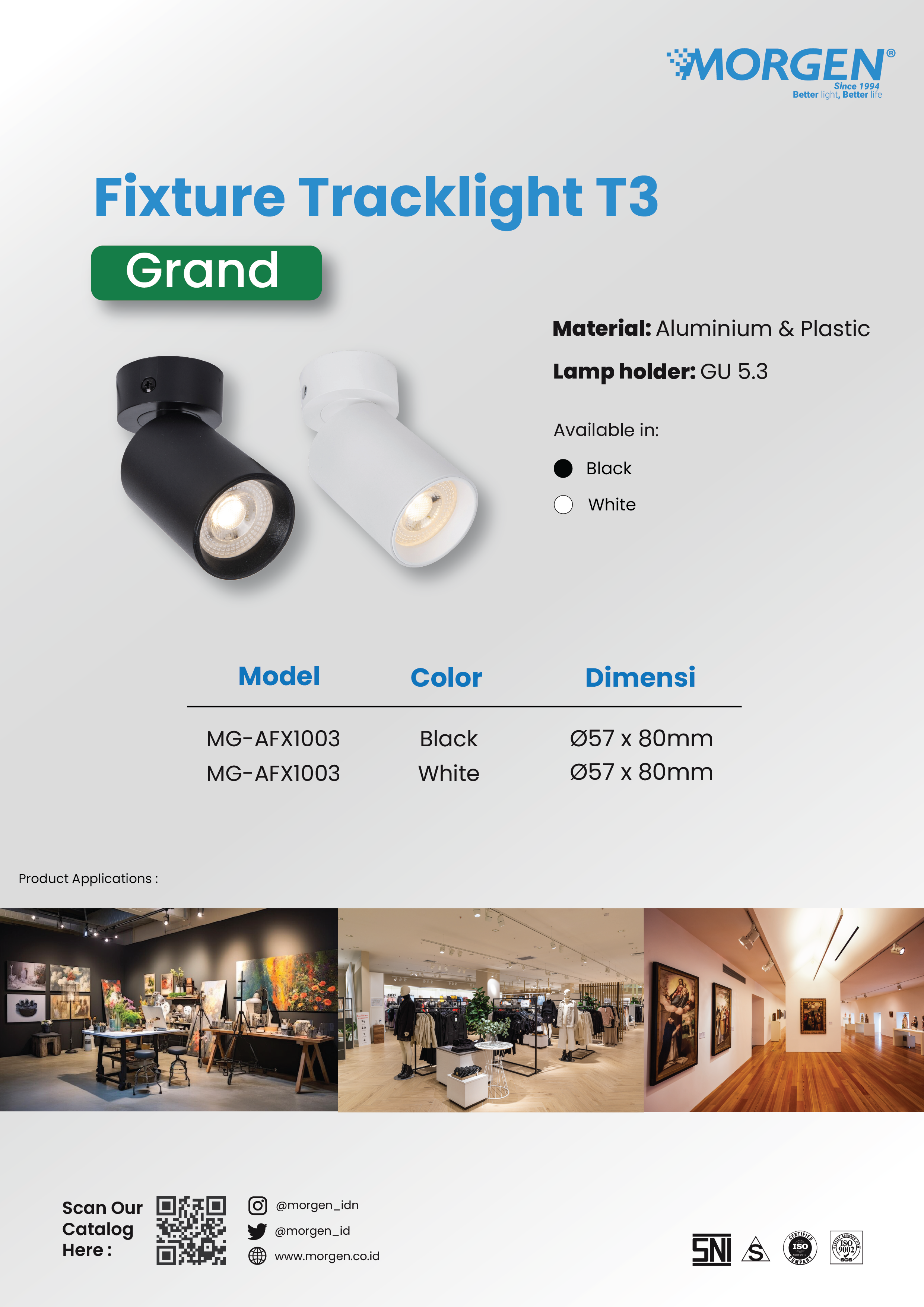 Morgen Fixture Tracklight T3 is a lamp housing better known as a lamp socket or lamp holder. Used as a connection between the lamp and the power source and functions to hold or hang the lamp safely. Suitable for various applications in commercial spaces such as art galleries, exhibitions, and clothing stores.