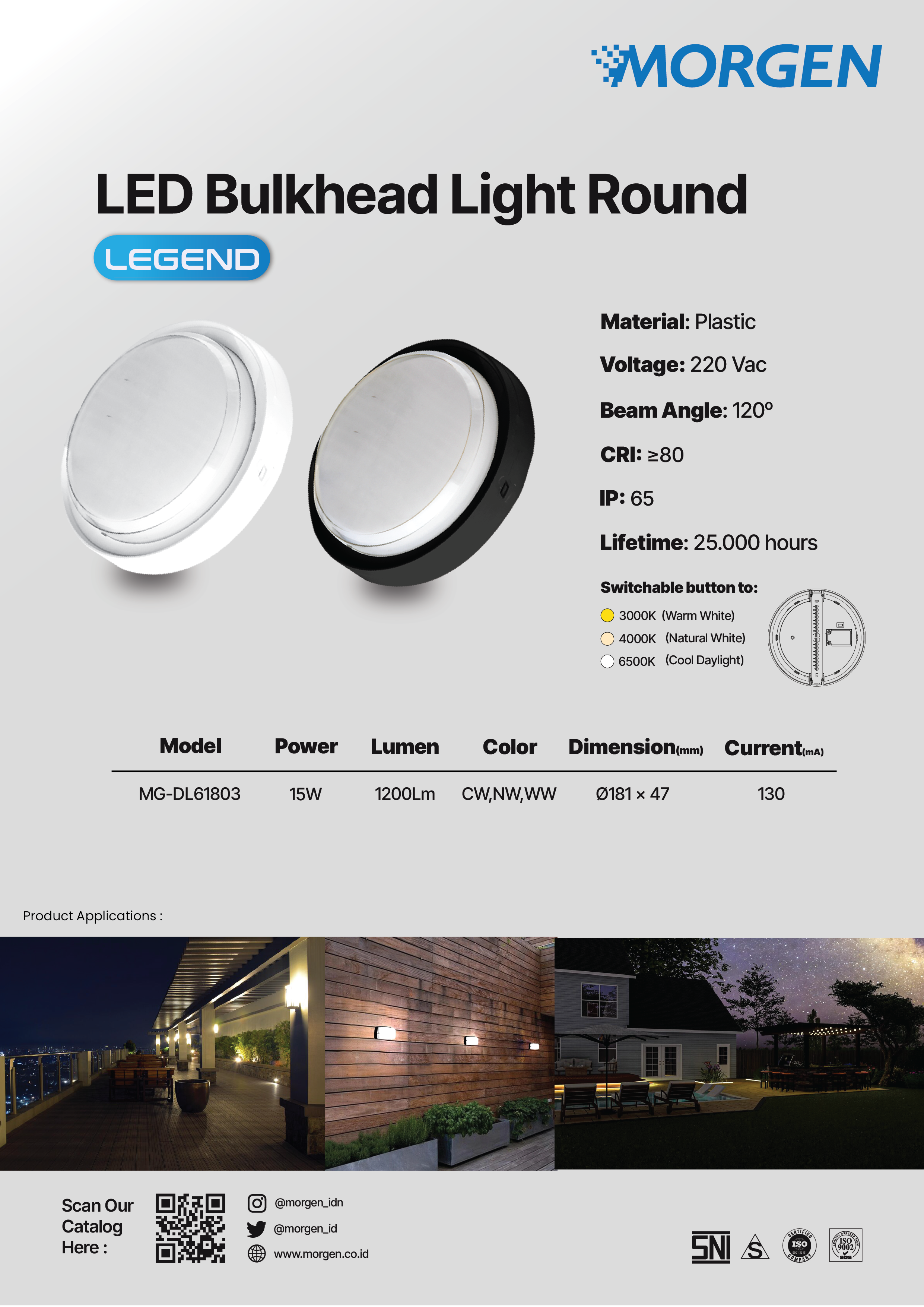 This lamp is equipped with a CCT switch that has 3 color choices in one lamp: Warm White (3000K), Natural White (4000K), and Cool Daylight (6500K). Simply slide the switch button, and adjust it according to your needs! Suitable for use in various places, both indoors and outdoors such as homes, offices, and shops.
